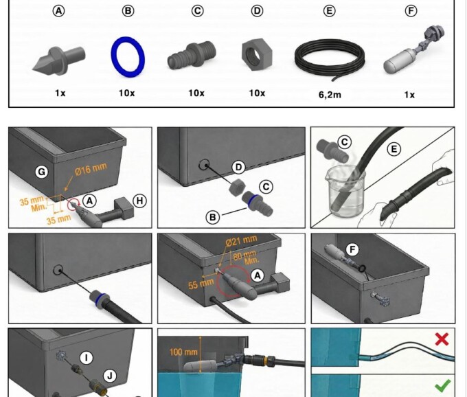 Pakken indeholder vandslange, pakninger, koblinger, flyder, bor og installationsvejledning.